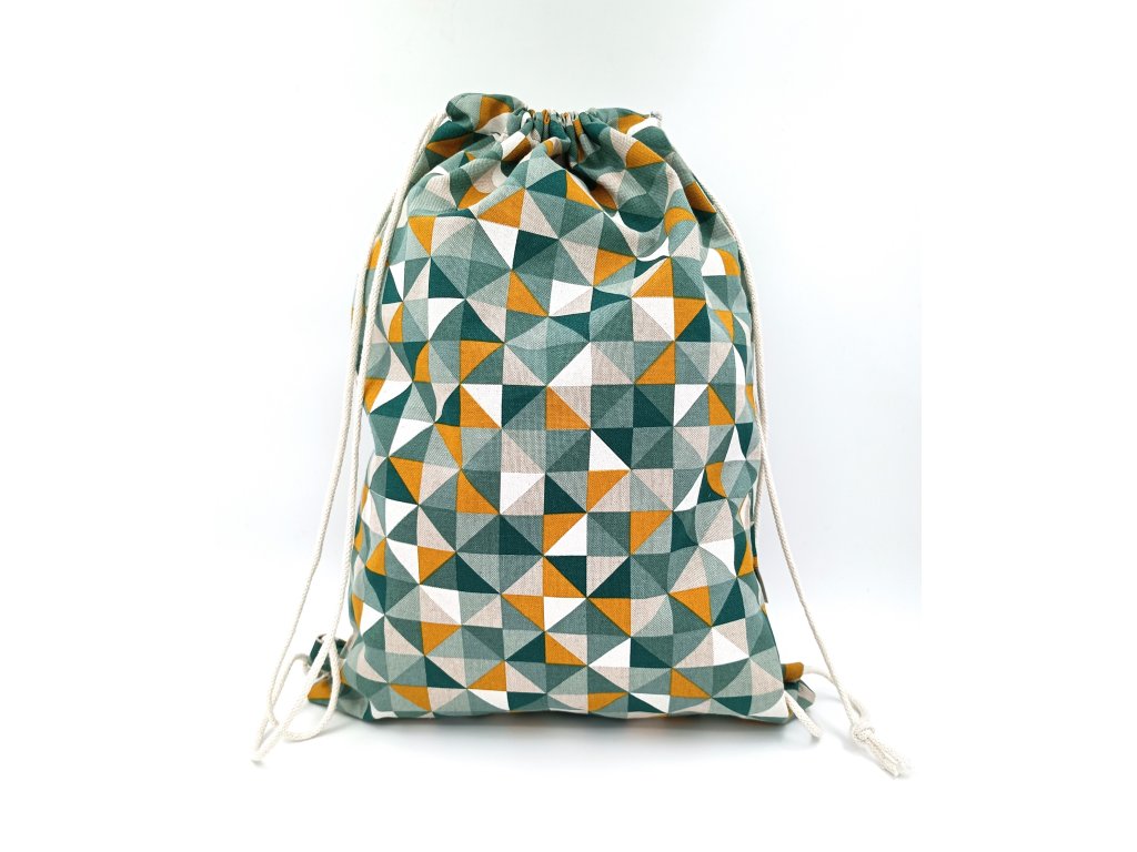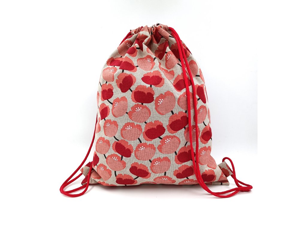Batoh z našeho ateliéru se hodí třeba na tělocvik. Jeho rozměry jsou přibližně 40 cm x 50 cm a má praktické stahovací provázky.