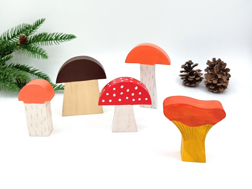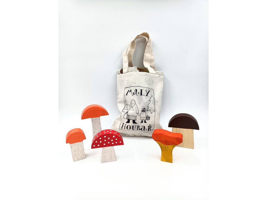 Pět dřevěných hub vyrobené z lipového dřeva o velikosti cca 8x12 cm, ošetřené nazávadnými barvami v plátěné taštičce.
