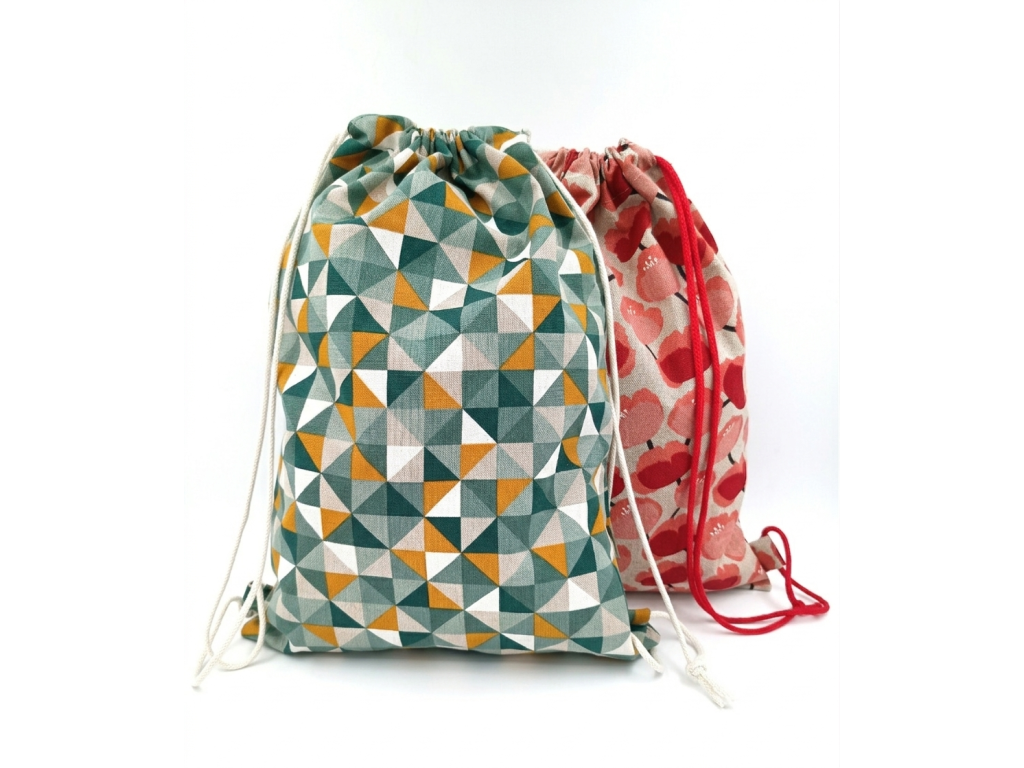 Batoh z našeho ateliéru se hodí třeba na tělocvik. Jeho rozměry jsou přibližně 40 cm x 50 cm a má praktické stahovací provázky.
