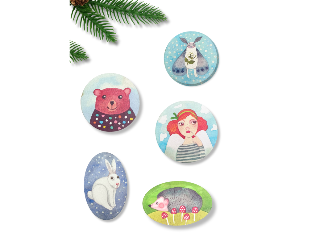 Obrázky magnetů jsou natištěné na dřevěném výřezu.