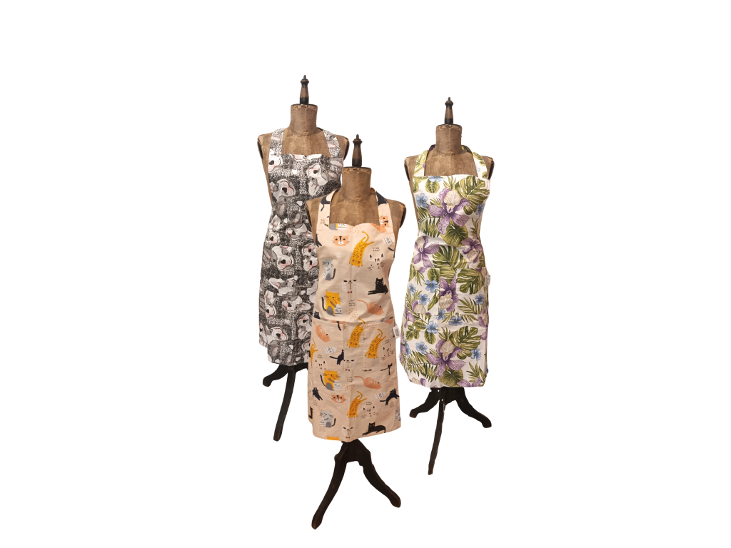 Zástěry mají v předu dvě praktické kapsy. Rozměry zástěr (cca): šířka 68 cm + 2 šňůrky na zavazování každá 47 cm, délka od krku dolů je 90 cm, pruh kolem krku je dlouhý 60 cm.